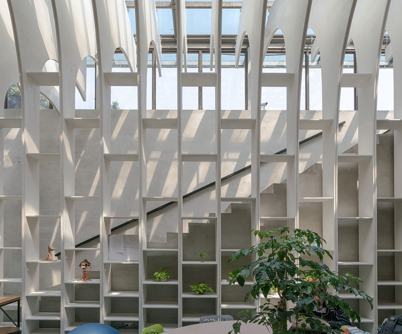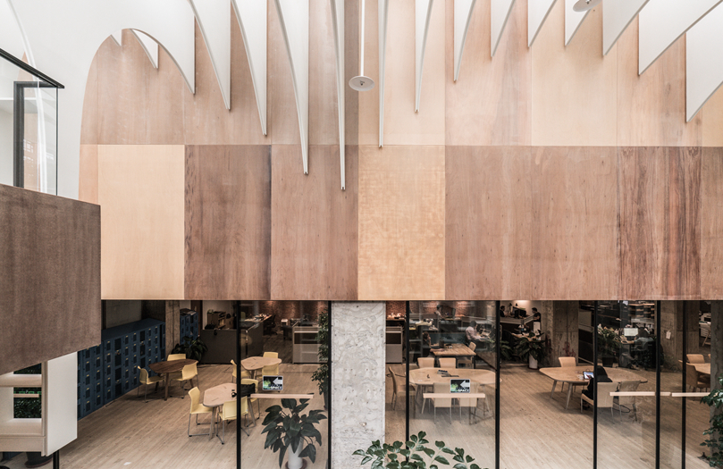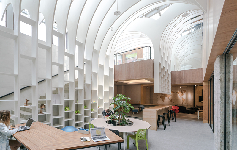 它是一個靈活的場所,可以根據用戶的不同需求進行調整-為工作,休息,會議,課程,或活動。白色的木板蜿蜒彎曲,形成空間的表皮,形成天花板、墻壁和架子的形狀。它們在暖色調的墻壁上拱起,劃分出不同空間的不同高度和層次,所有這些都在柔和的光線下擴散,形成一個有凝聚力的整體。