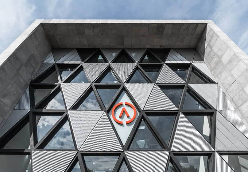 為了與綠樹成蔭的溪流建立聯(lián)系,從公司的大堂就營造了視覺效果。同時,延伸到建筑外部的外部露臺。外主立面設計為三角形圖案,以公司的企業(yè)形象為參照,具有象征性和獨特性,圖案的基本模塊對應于組織標識的同型,該標識包含在立面的中心部分。